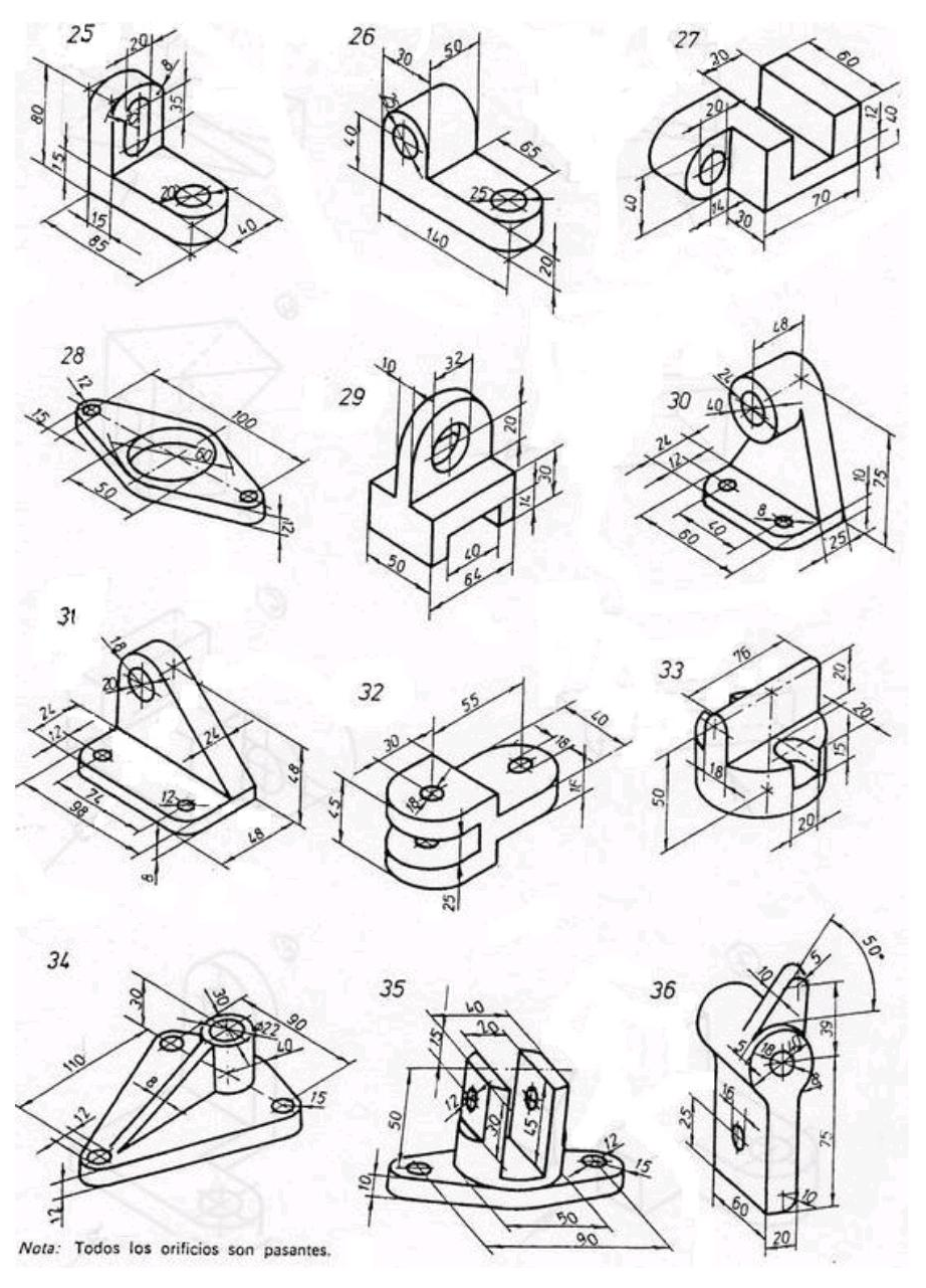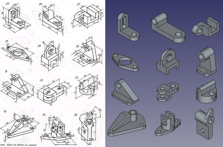 I found a page of random dimensioned objects that I wanted to try modelling. It became apparent pretty quickly that they weren't drawn to scale. Some dimensions were missing and I purposely added an extra hole to #33. The two things I learned were that the end point tangency constraint existed and that you don't have to anchor a sketch to a face of the current object as long as the operation you use that sketch for results in a contiguous shape. Link to original image.