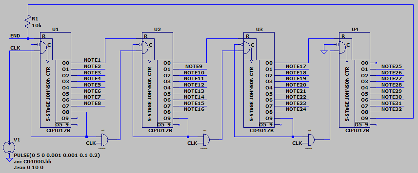 Below is an example of a cascaded counter that uses the CD4017 counter and CD4081 AND gate. Note the directive in the bottom left.